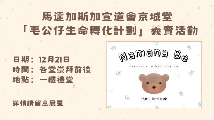 「Namana be」是馬達加斯加語,最好朋友的意思。「Namana be」毛工仔的誕生,是為一班病童而做。他們因為身體異常,手術前常被人嘲笑、欺凌。願毛公仔能成為他們最好的朋友,陪伴經歷醫治和成長。無數病人和家人因著短宣隊的愛心服侍,身心靈得著醫治。他們深深經歷到神的大愛和真實,很多因而決志信主,立志每天倚靠神。